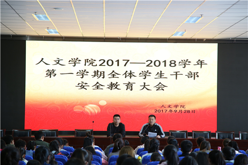 为增强同学们的安全防范意识,提高同学们的安全防范能力,全面普及全体学生干部安全教育。9月28日中午,人ok1188诸侯快讯官方在贺兰山校区文荟楼东侧报告厅举行了2017—2018学年第一学期全体学生干部安全教育大会。学院党委副书记马小军,2017级辅导员潘巍出席了会议, 学院全体学生干部参加。