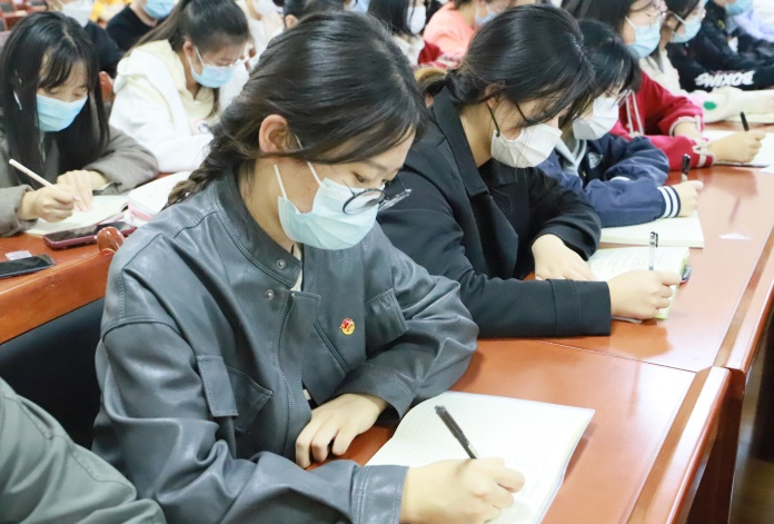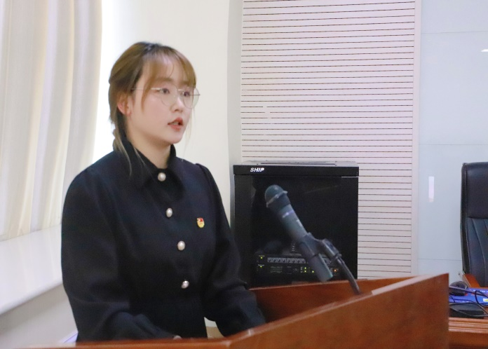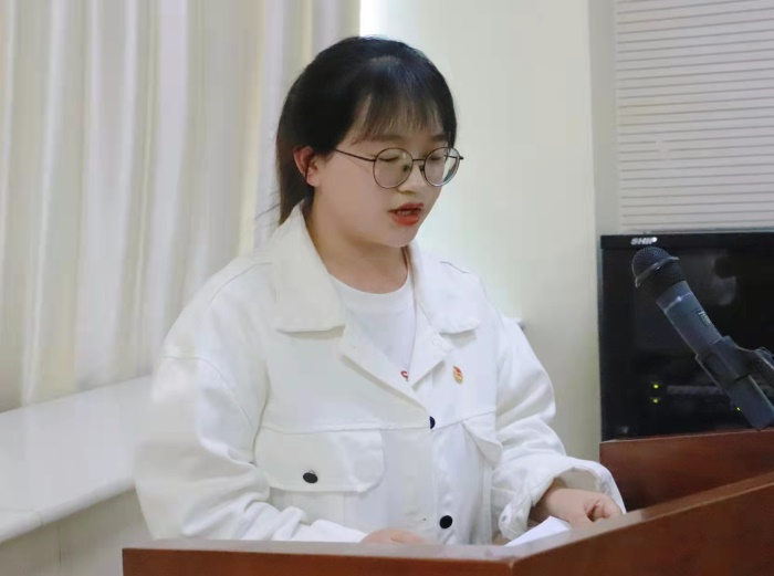 来自2020级汉语言文学(教师教育)2班的叶芯瑜同学作为入党积极分子代表发言。她结合自己的所学专业和志愿服务经历,表明自己坚定向中国共产党靠拢的决心。她还表示,青年学生应当将青春投入奋斗,勇担重任,迎难而上。