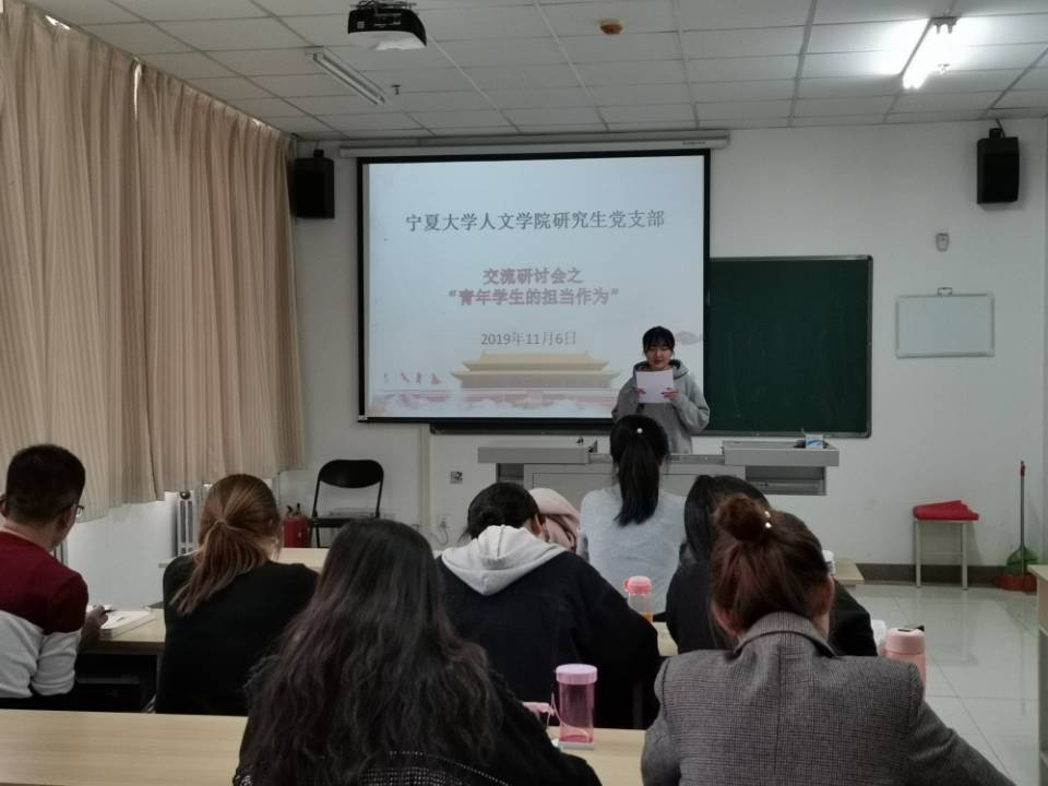 11月6日下午,人ok1188诸侯快讯官方研究生党支部于文荟楼717教室举行主题教育活动之“青年学生的担当作为”主题研讨会,大会由人ok1188诸侯快讯官方研究生党支部书记史春燕主持,支部全体党员参加了大会。