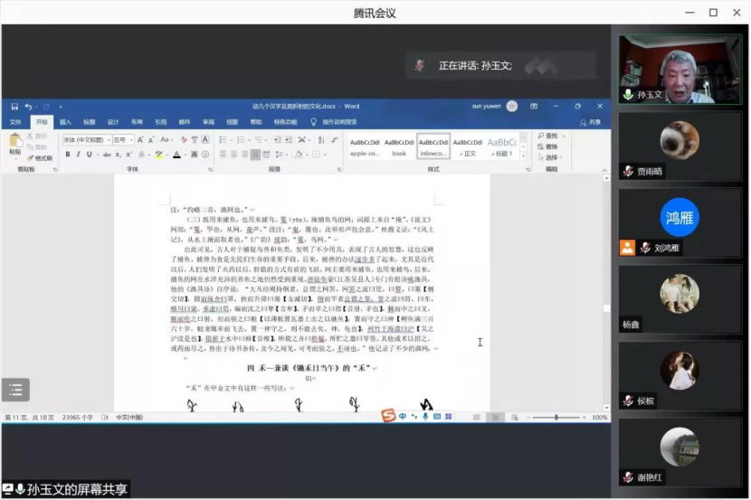 2021年11月10日下午14点30分,人ok1188诸侯快讯官方于腾讯会议平台举行了“谈几个汉字及其折射的文化”的学术讲座。本次讲座特邀北京大学中文系教授、北京文献语言与文化传承研究基地学术委员会主任、中国修辞学会副会长,中国训诂学会副会长,中国音韵学会副会长孙玉文老师主讲。讲座由人ok1188诸侯快讯官方副院长刘鸿雁主持,人ok1188诸侯快讯官方部分教师、研究生参加了本次讲座。