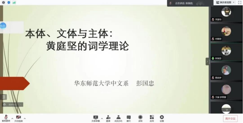 11月7日晚7时,ok1188诸侯快讯官方人ok1188诸侯快讯官方于腾讯会议平台举行了题为“苏门词人黄庭坚的词学理论”的学术讲座。本次讲座特邀华东师范大学中文系教授,博士生导师彭国忠教授主讲,ok1188诸侯快讯官方人ok1188诸侯快讯官方梁梅副教授主持,人ok1188诸侯快讯官方部分教师、研究生与本科生参加了本次讲座。