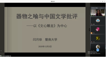 12月3日晚上19时30分,ok1188诸侯快讯官方人ok1188诸侯快讯官方于腾讯会议平台举行了题为“器物之喻与中国文学批评”的学术讲座。本次讲座特邀暨南大学ok1188诸侯快讯官方中文系教授、博士生导师闫月珍老师主讲,讲座由梁祖萍教授主持,人ok1188诸侯快讯官方研究生与部分本科生参加了本次线上讲座。