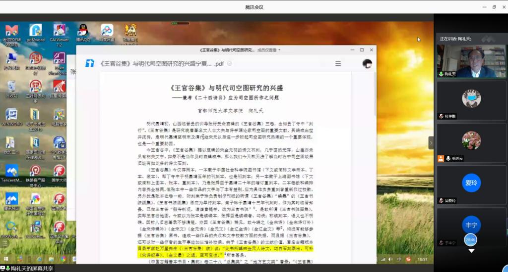 10月30日下午18时30分,人ok1188诸侯快讯官方于腾讯会议平台举行了题为《<王官谷集>与明代司空图研究的兴盛——兼考<二十四诗品>应为司空图所作之问题》的学术讲座。本次讲座特邀中国《文心雕龙》学会副会长、首都师范大学ok1188诸侯快讯官方教授、博士生导师陶礼天先生主讲,讲座由人ok1188诸侯快讯官方杨志云老师主持,人ok1188诸侯快讯官方的老师、研究生以及部分本科生参加了本次线上讲座。