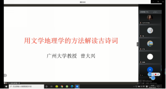 10月23日晚,题为“用文学地理学的方法解读古诗词”的讲座在腾讯会议平台举行,广州大学人ok1188诸侯快讯官方教授、文学地理学研究中心主任、中国文学地理学会会长、中国词学研究会常务理事曾大兴教授应邀主讲。讲座由人ok1188诸侯快讯官方梁祖萍教授主持,人ok1188诸侯快讯官方研究生及部分本科生参加。