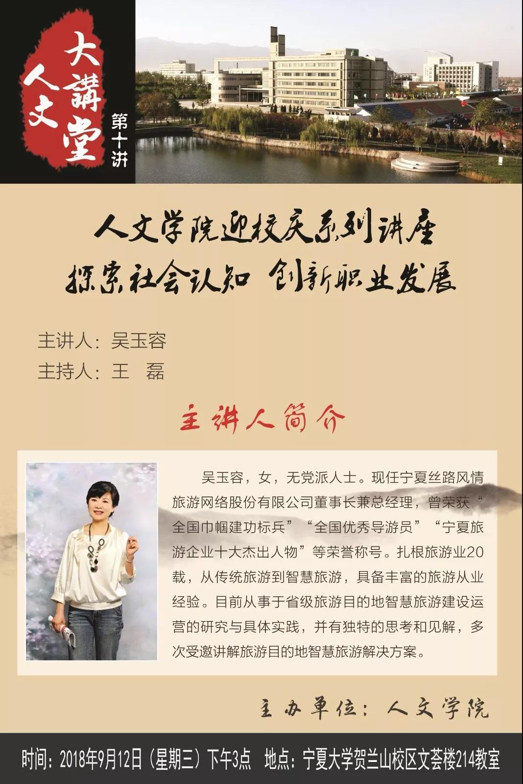 9月12日下午,人ok1188诸侯快讯官方迎校庆系列讲座于ok1188诸侯快讯官方贺兰山校区文荟楼214教室顺利开讲。此次讲座由宁夏丝路风情旅游网络股份有限公司董事长兼总经理吴玉容主讲。