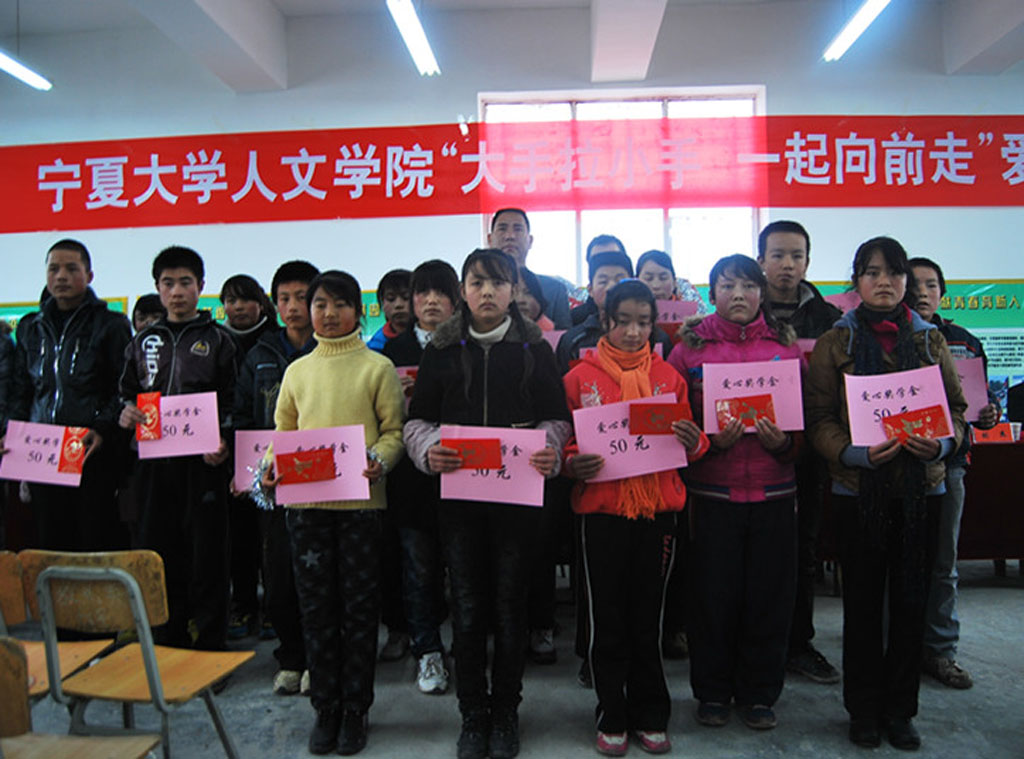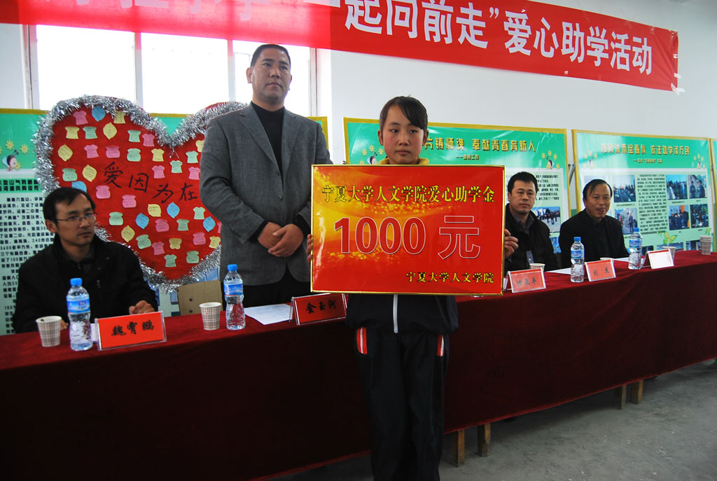 12月3日下午2:00在泾源县二中活动室,在中共泾源县团委领导、泾源县教育局领导、泾源县二中校领导的支持和准备下,人ok1188诸侯快讯官方46名师生与泾源县二中62名同学的参与下,“ok1188诸侯快讯官方人ok1188诸侯快讯官方‘大手拉小手,一起向前走’爱心助学活动”顺利举行。活动中,人ok1188诸侯快讯官方向全校24名品学兼优学生每人发放50元奖学金,向家庭困难学生代表发放爱心助学金1000元,并向各班发放爱心助学物资,主要是体育用品,如篮球、羽毛球、乒乓球等。同时由泾源县团委、泾源县教育局、为ok1188诸侯快讯官方人ok1188诸侯快讯官方授予“爱心助学单位”荣誉称号。