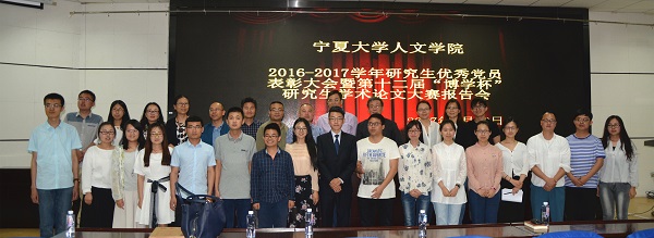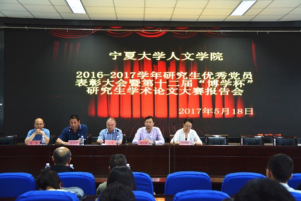5月18日晚7点,人ok1188诸侯快讯官方2016—2017学年研究生优秀党员表彰大会暨第十二届“博学杯”研究生学术论文大赛报告会在贺兰山校区文科楼一楼东侧报告厅隆重举行。人ok1188诸侯快讯官方党委书记马正亮,院长胡玉冰,副书记金玉河,副院长刘鸿雁、杨浣等领导出席了大会,蔡永贵、霍维洮、钟亚军、杨文笔、丁峰山等老师为获奖学生论文进行了现场点评。人ok1188诸侯快讯官方全体研究生参加了大会。