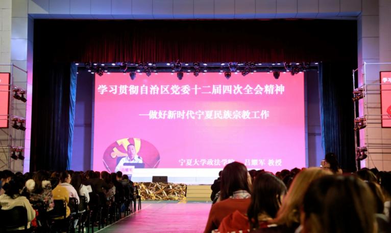 为学习宣传贯彻自治区党委十二届四次全会精神,帮助广大师生牢固树立马克思主义民族观、宗教观,准确把握党的民族宗教理论和方针政策,把思想和行动统一到中央精神和自治区党委决策部署上来,为推动我区民族团结进步创建示范区建设作出积极贡献。10月24日下午,人ok1188诸侯快讯官方(回族研究院)在文萃校区大学生活动中心举办了民族团结进步教育宣讲活动。此次讲座由学院党委副书记金玉河主持,政法学院吕耀军教授主讲,人ok1188诸侯快讯官方和回族研究院全体师生800余人参加了讲座。