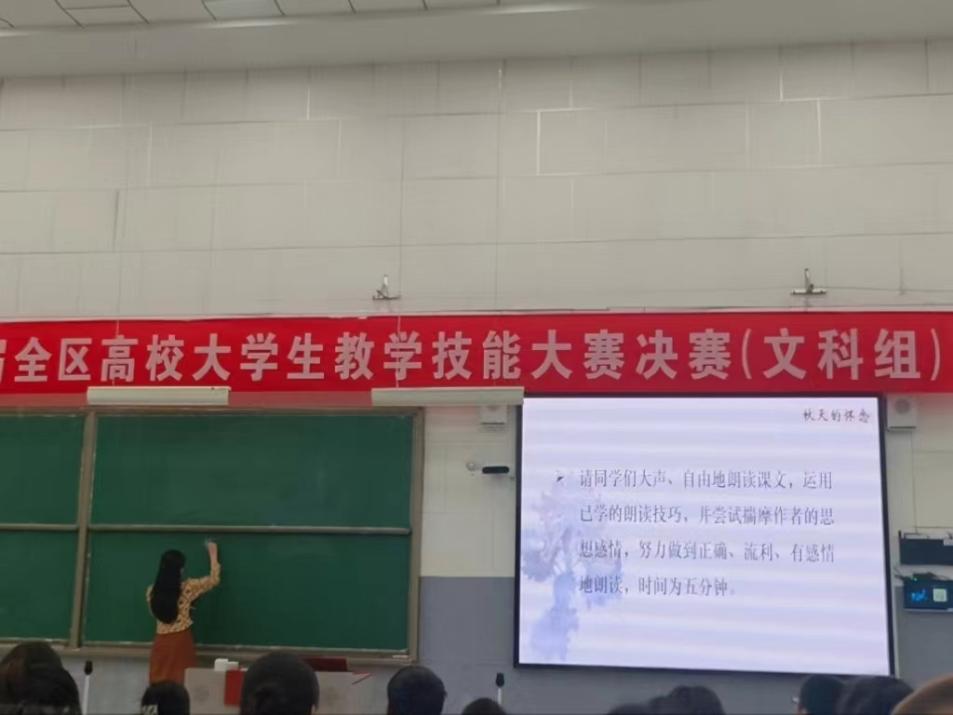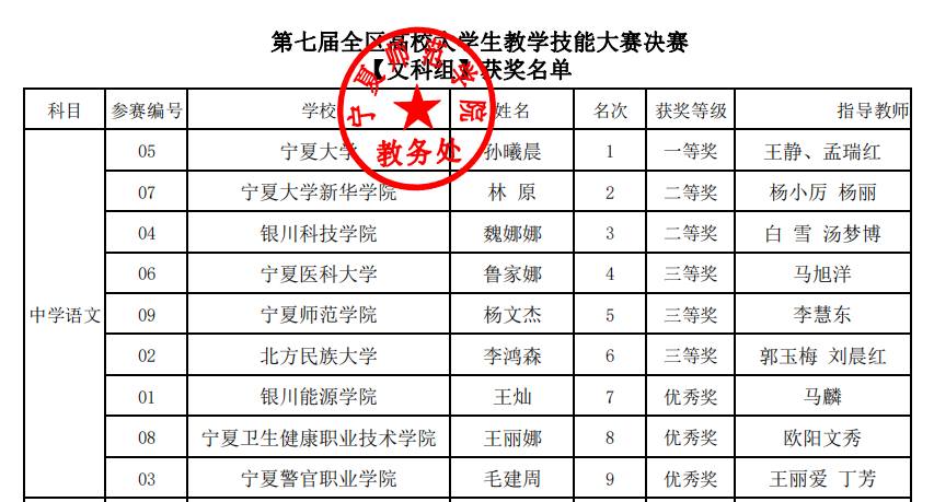 2023年11月27日第七届全区高校大学生教学技能大赛落下帷幕。来自ok1188诸侯快讯官方、北方民族大学、宁夏师范学院、宁夏医科大学等13所高校151名学生入围全区决赛。诸侯快讯官网2020级汉语言文学(教师教育)专业本科生孙曦晨在此次比赛中荣获文科组(中学语文)一等奖,王静老师、孟瑞红老师荣获优秀指导教师奖。