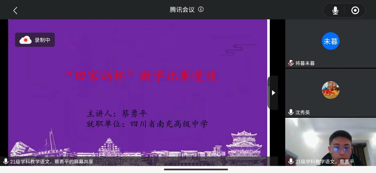 蔡勇平同学从深入理解比赛文件、熟悉比赛流程入手,分享参赛经验和心得体会。“凡事预则立,不预则废”,他强调备赛的重要性,学生在备赛的过程中应注意区分比赛课程和平时教学课程的差异。同时他还就如何进行教学设计、查找优质教学资源,对于录课过程中的设备以及数字化技术的使用,给予了细致入微的建议。